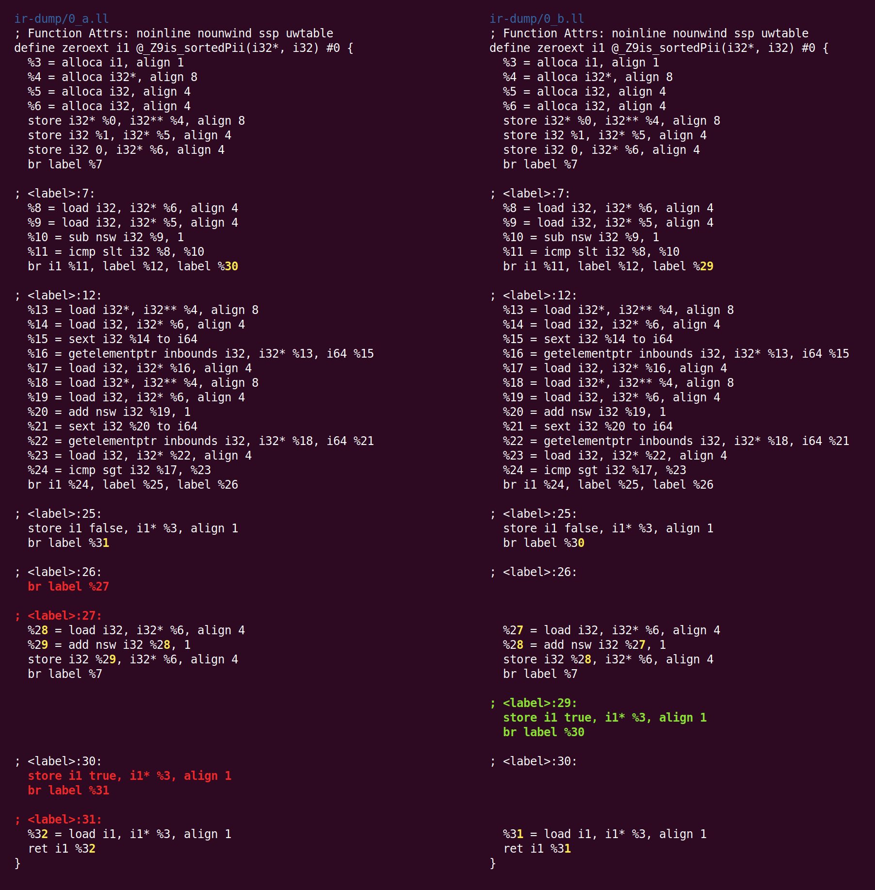 Here, basic block 26 simply jumps to block 27. This kind of block can be eliminated, with jumps to it being forwarded to the destination block. The diff is a bit more confusing that it would have to be due to the implicit block renumbering performed by LLVM. The full set of transformations performed by SimplifyCFG is listed in a comment at the top of the pass: