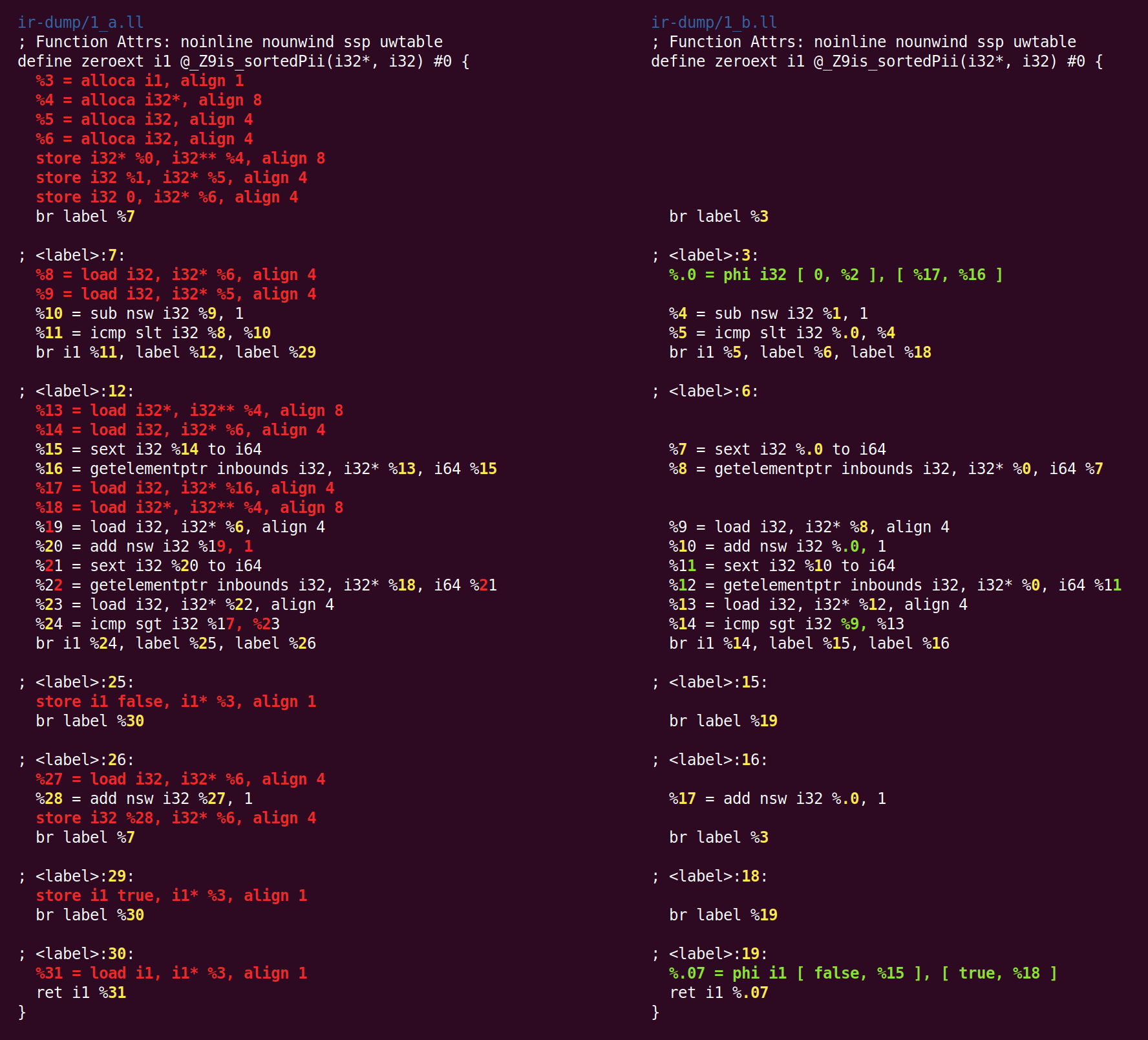 Here’s the IR file emitted by Clang (I manually removed the “optnone” attribute that Clang put in) and this is the command line that we can use to see the effect of each optimization pass: