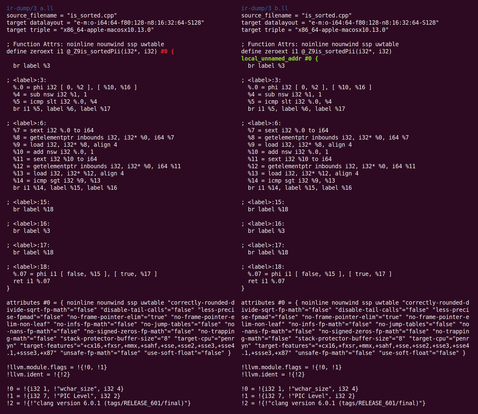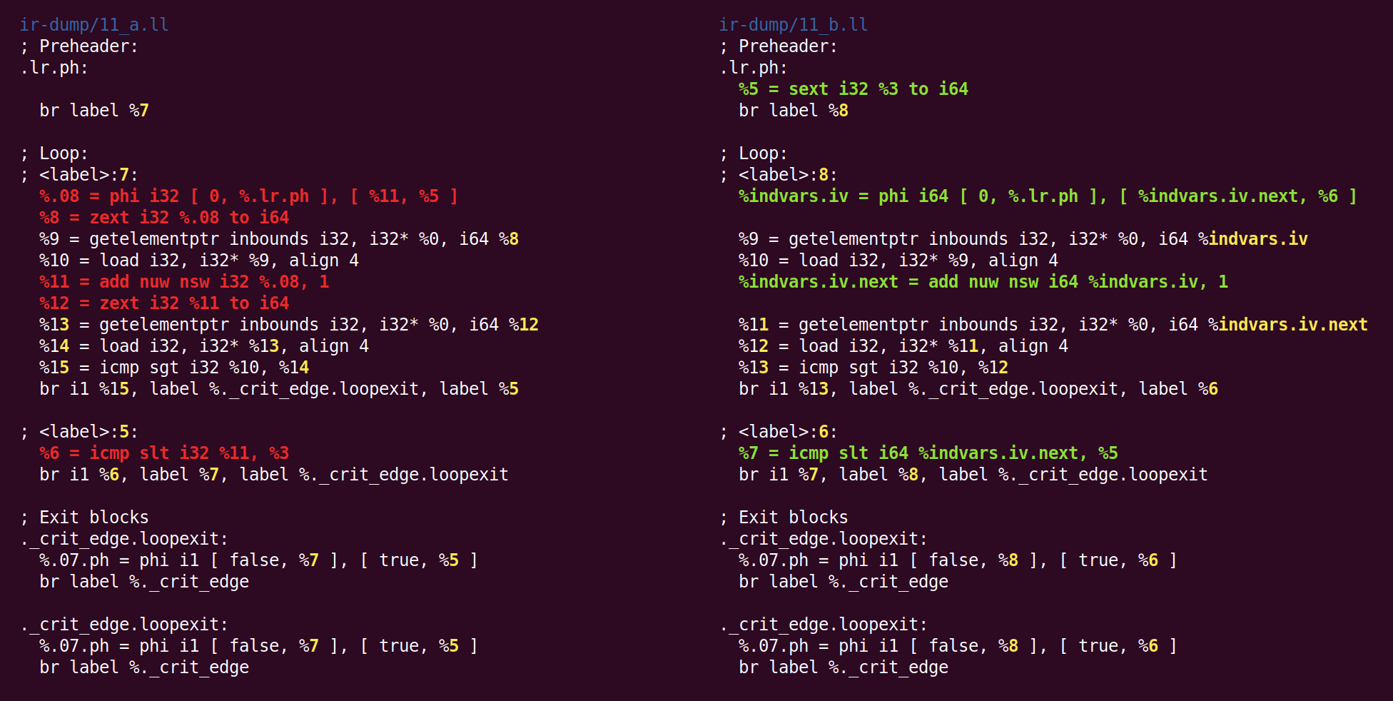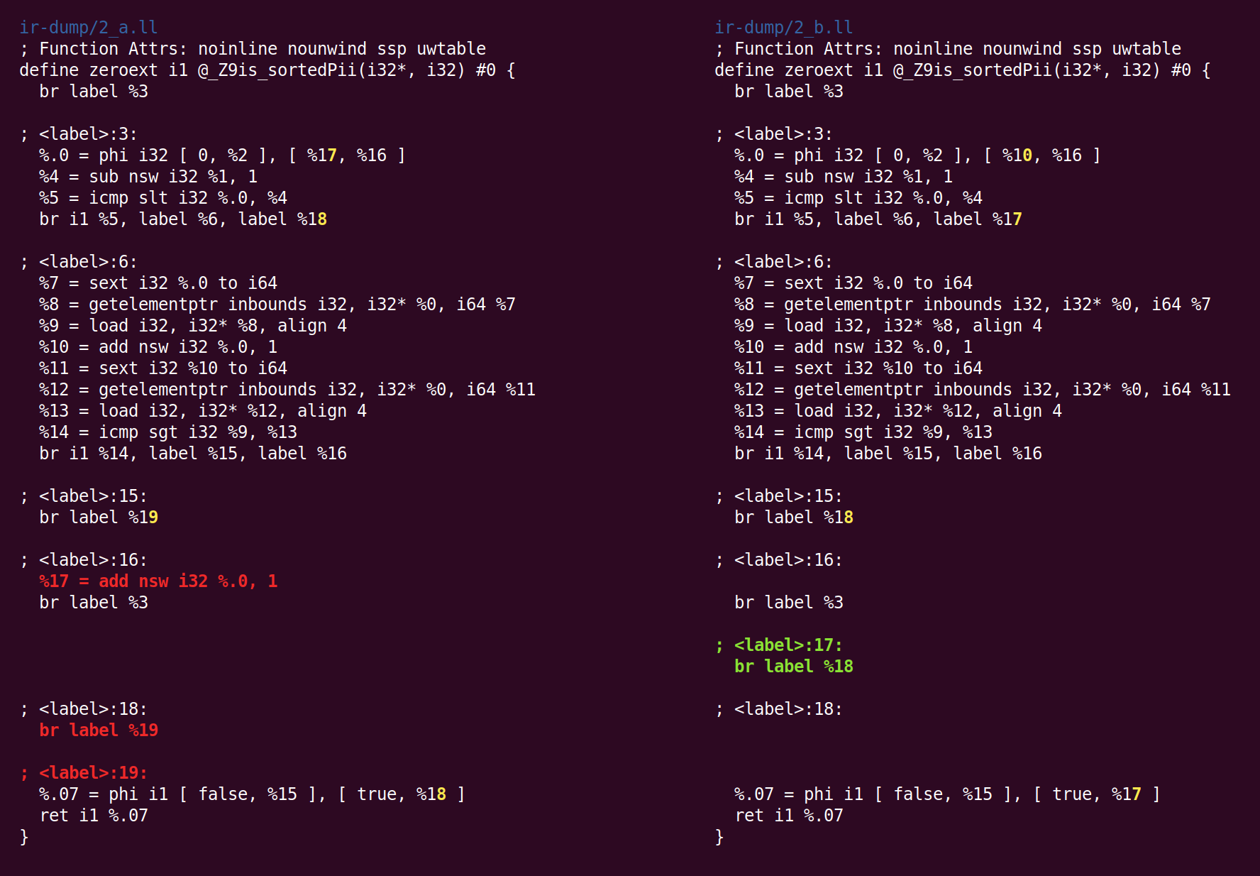 Now “global value numbering” performs a very clever optimization. Showing this one off is basically the entire reason that I decided to write this blog post. See if you can figure it out just by reading the diff: