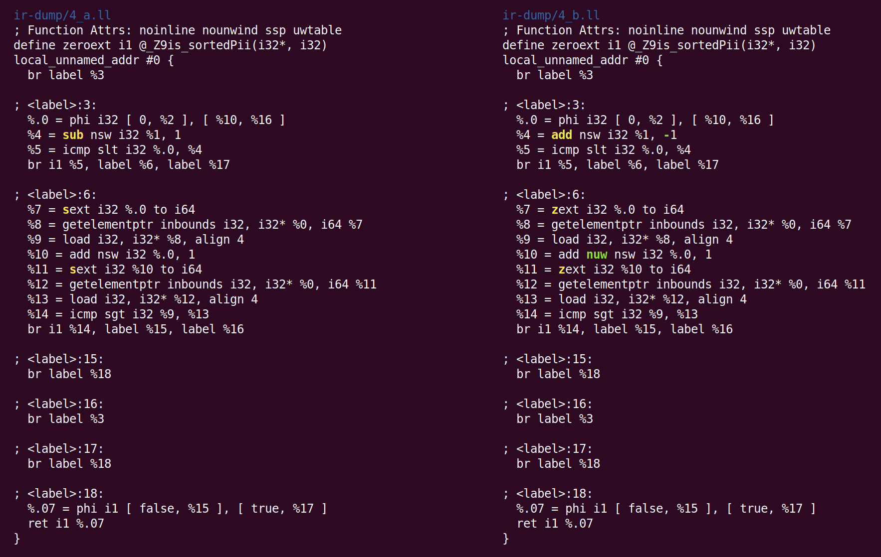 Here instead of subtracting 1 from %1 to compute %4, we’ve decided to add -1. This is a canonicalization rather than an optimization. When there are multiple ways of expressing a computation, LLVM attempts to canonicalize to a (often arbitrarily chosen) form, which is then what LLVM passes and backends can expect to see. The second change made by InstCombine is canonicalizing two sign-extend operations (sext instructions) that compute %7 and %11 to zero-extends (zext). This is a safe transformation when the compiler can prove that the operand of the sext is non-negative. That is the case here because the loop induction variable starts at zero and stops before it reaches n (if n is negative, the loop never executes at all). The final change is adding the “nuw” (no unsigned wrap) flag to the instruction that produces %10. We can see that this is safe by observing that (1) the induction variable is always increasing and (2) that if a variable starts at zero and increases, it would become undefined by passing the sign wraparound boundary next to INT_MAX before it reaches the unsigned wraparound boundary next to UINT_MAX. This flag could be used to justify subsequent optimizations.