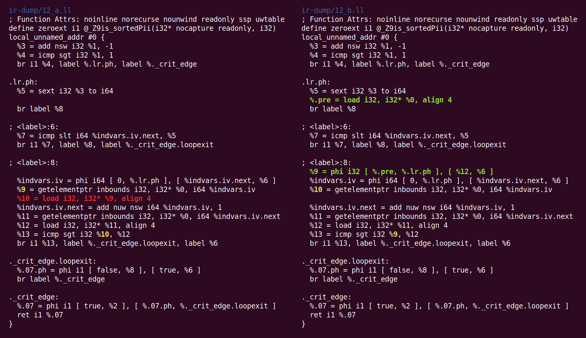Got it? Ok, the two loads in the loop on the left correspond to a[i] and a[i + 1]. Here GVN has figured out that loading a[i] is unnecessary because a[i + 1] from one loop iteration can be forwarded to the next iteration as a[i]. This one simple trick halves the number of loads issued by this function. Both LLVM and GCC only got this transformation recently.